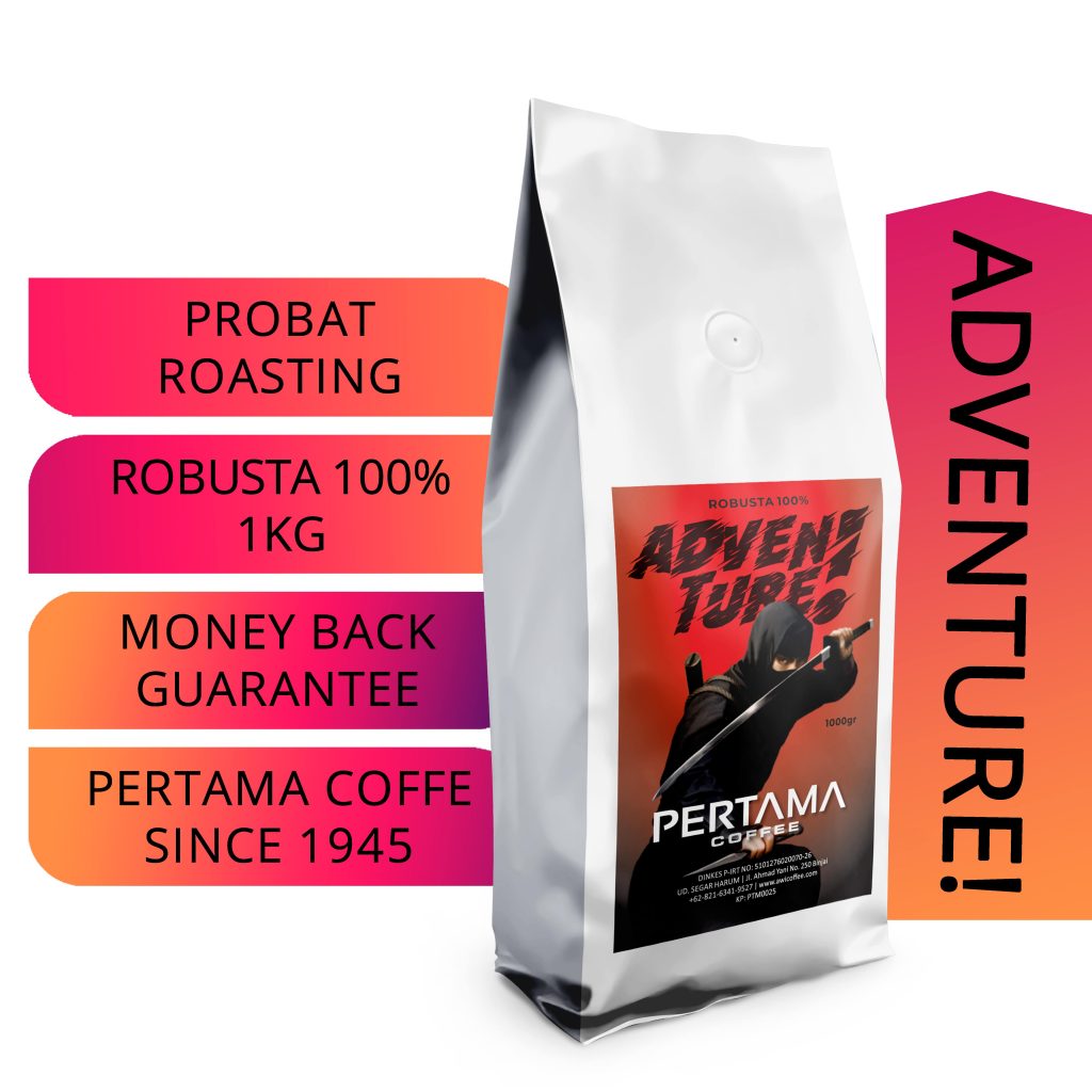 KOPI PERTAMA ADVENTURE adalah KOPI ROBUSTA JAVA GRADE2 100%. Kopi-kopinya diroasting dengan mesin PROBAT di level roasting FULL CITY medium dark. ARABICA memberikan dominan rasa coklat caramel, sedangkan ROBUSTA memberikan aroma bitter chocolate and woody. Ini menjadi kombinasi yang disukai kebanyakan pencinta kopi INDONESIA.