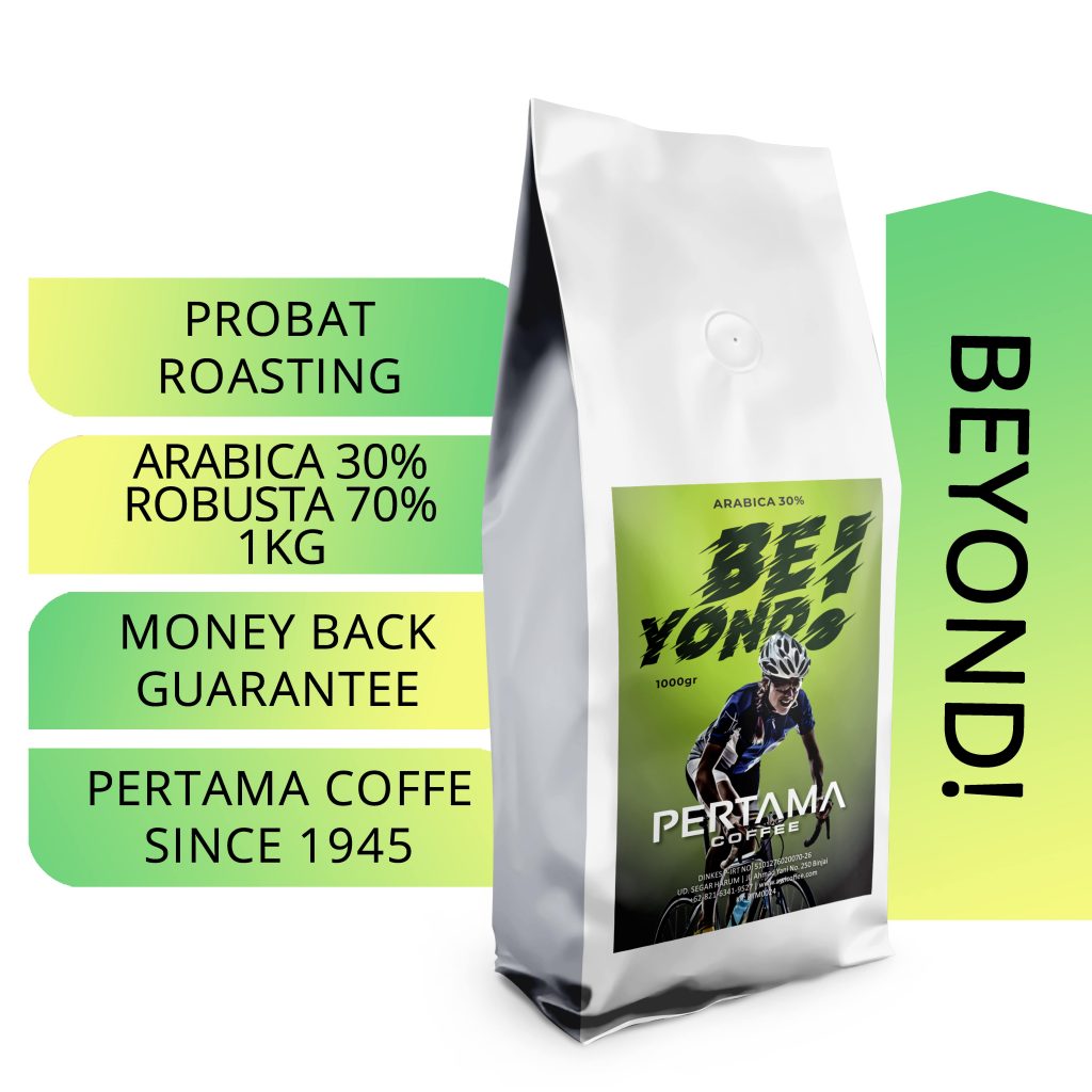 KOPI PERTAMA BEYOND adalah BLEND dari ARABICA Sumatra Grade2 30% dan ROBUSTA JAVA GRADE2 30%. Kopi-kopinya diroasting dengan mesin PROBAT di level roasting FULL CITY medium dark. ARABICA memberikan dominan rasa coklat caramel, sedangkan ROBUSTA memberikan aroma bitter chocolate and woody. Ini menjadi kombinasi yang disukai kebanyakan pencinta kopi INDONESIA.