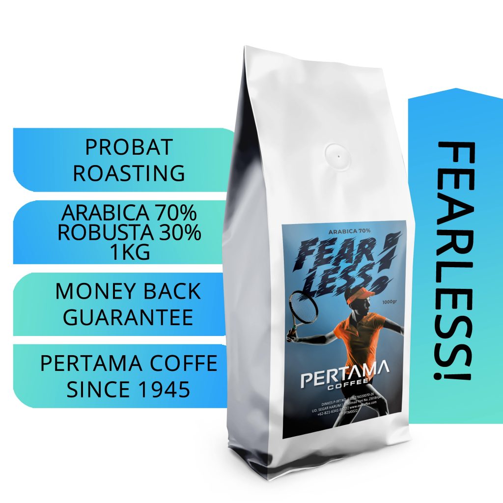 KOPI PERTAMA FEARLESS adalah BLEND dari ARABICA Sumatra Grade2 70% dan ROBUSTA JAVA GRADE2 30%. Kopi-kopinya diroasting dengan mesin PROBAT di level roasting FULL CITY medium dark. ARABICA memberikan dominan rasa coklat caramel, sedangkan ROBUSTA memberikan aroma bitter chocolate and woody. Ini menjadi kombinasi yang disukai kebanyakan pencinta kopi INDONESIA.